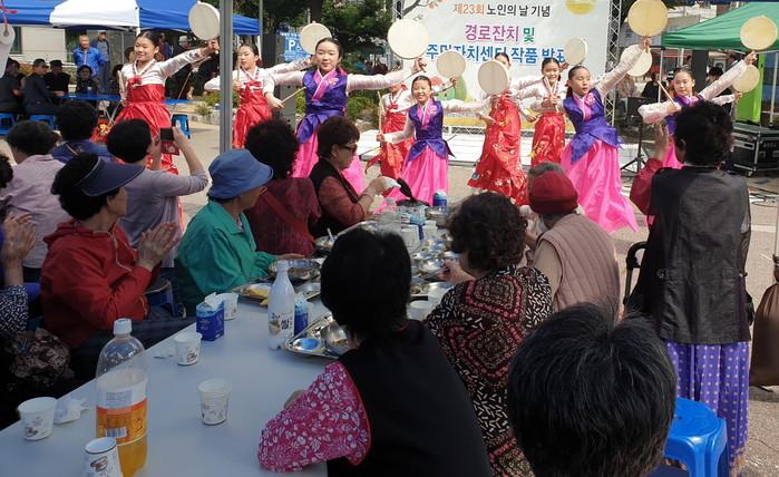 경기 안산시 상록구 본오2동은 최근 행정복지센터 앞마당에서 ‘제23회 노인의 날 기념 경로잔치 및 주민자치센터 프로그램 작품발표회’를 개최했다. 이날 봉사자들은 노인들에게 직접 준비한 음식을 대접했다. 사진은 공연을 즐기는 노인들 모습.(사진제공=안산시청)