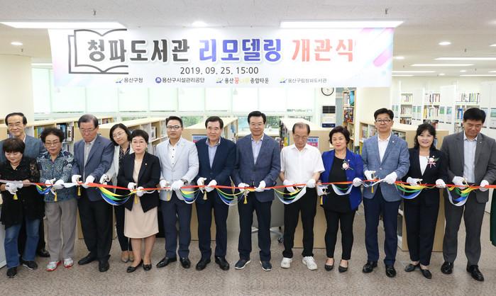 성장현 서울 용산구청장이 최근 '구립청파도서관 리모델링 개관식'에 참석했다. 이날 행사는 성 구청장을 비롯해 김정재 의장, 도서관 관계자, 주민 등이 참석한 가운데 진행됐다. 사진은 성 구청장(오른쪽에서 여섯 번째)과 관계자들이 테이프 커팅을 하는 모습. (사진제공=용산구청)