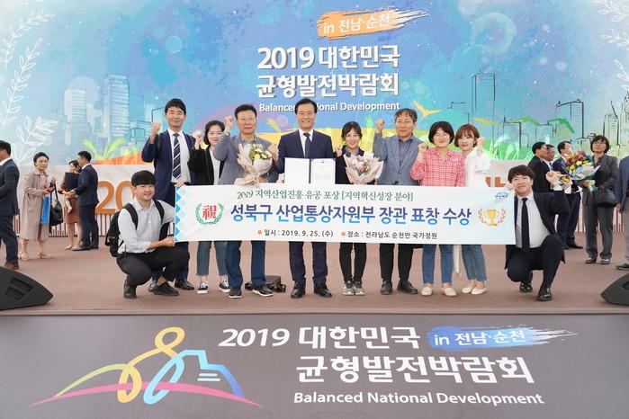 서울 성북구가 최근 산업통상자원부와 국가균형발전위원회에서 주최한 '2019 대한민국 균형발전박람회'에서 '성북창작소' 등의 혁신사례와 창업지원활동 등을 인정받아 장관표창을 받았다. 사진은 수상 후 이승로 구청장과 관계자들의 기념촬영 모습. (사진제공=성북구청)