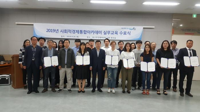 인천 동구는 최근 주민행복센터에서 ‘2019년 사회적경제통합아카데미 실무교육’ 수료식을 개최했다. 사회적통합아카데미는 사회적경제 활성화 기반을 마련하고, 교육의 효율성을 증진시키기 위해 진행됐다. 사진은 수료생들이 기념촬영을 하는 모습.(사진제공=동구청)