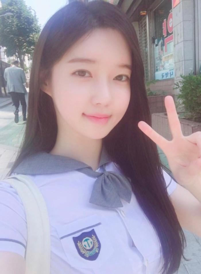 공개된 사진 속 김유진은 세일러 교복을 입고 미소 짓고 카메라를 쳐다보고 있는 모습이 담겨 있다.