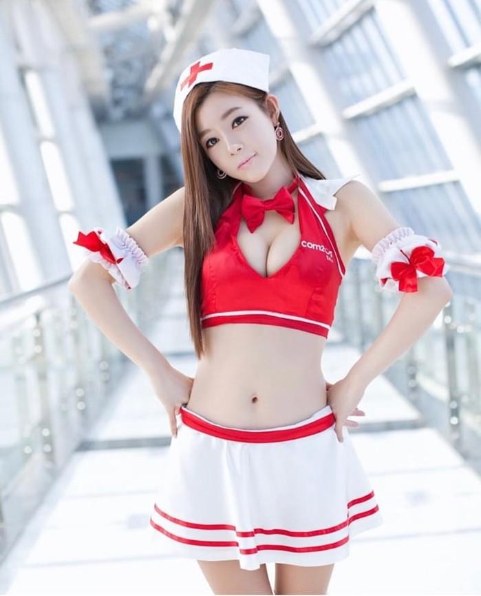 공개된 사진 속 지연수는 간호사 코스프레 복장을 입고 카메라를 쳐다보고 있다.