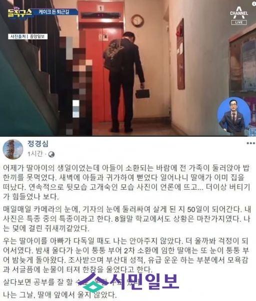 정경심 교수는 글을 통해 "어제(24일)가 딸아이의 생일이었는데 아들이 소환되는 바람에 전 가족이 둘러앉아 밥 한끼를 못 먹었다. 새벽에 아들과 귀가하여 뻗었나 일어나니 딸애가 이미 집을 떠났다. 연속적으로 뒷모습 고개숙인 모습 사진이 언론에 뜨고... 더이상 버티기가 힘들었나 보다."라며 "조사받으며 부산대 성적, 유급 운운하는 부분에서 모욕감과 서글픔에 눈물이 터져 한참을 울었다고 한다"라고 전했다.