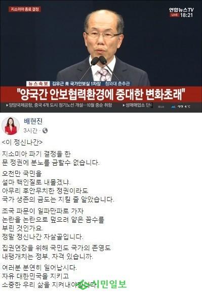 배현진 자유한국당 송파을 당협위원장은 지난 8월 22일 정부가 한일군사정보보호협정(GSOMIA·지소미아)을 연장하지 않기로 결정한 것과 관련해 “문재인 정권에 분노를 금할 수 없다”고 말문을 열었다.