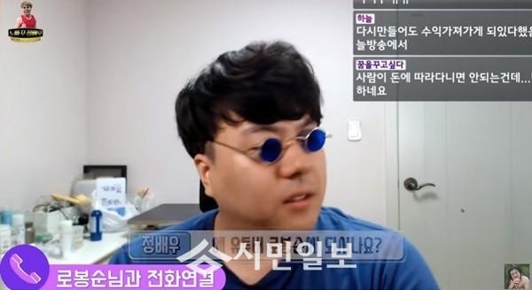 앞서 정배우는 20일 자신의 유튜브 채널 '정배우JungTube'를 통해 ACCA 에이전시 대표 BJ 턱형과 소속 BJ들간의 부당 계약 의혹과 관련해 BJ 로봉순과의 전화연결을 시도해 눈길을 모았다.