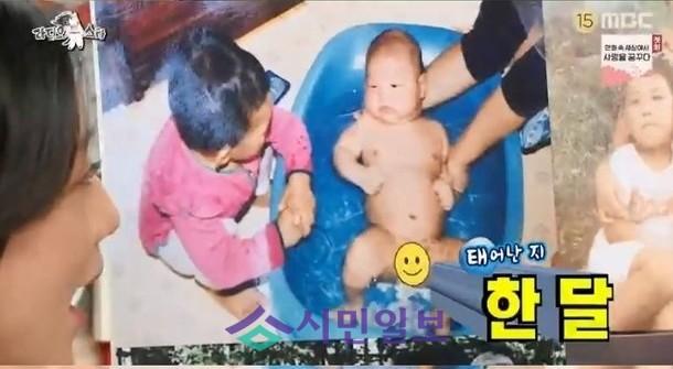 하승진은 가지고 온 생후 한달이 지난 어린시절 사진을 공개했다. 돌은 된 듯한 아가의 모습에 오윤아는 토끼눈을 뜨며 놀라움을 감추지 못했다.