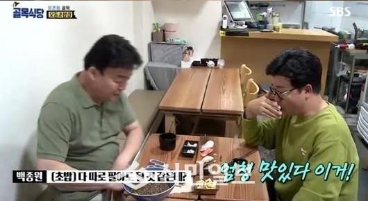 백종원이 초밥을 시식했다. 이어 김성주를 소환했다. 정확한 비린내 체크를 위해서였다. 김성주는 이를 시식하더니 "좋다"면서 고소하다고 했다. 백종원도 "연어가 잘 만하면 이런 매력이 있다"고 호평했다. 이에 사장은 안도하더니 "매일 가락시장에서 사다가 손질하는 것"이라며 입가에 미소를 띄었다.
