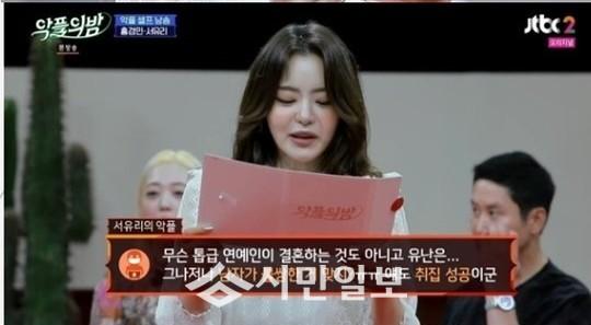 이날 서유리는 최근 ‘에덴의 동쪽’ ‘미씽나인’ ‘앵그리맘’ 등을 연출한 최병길 PD와 결혼식 없이 혼인신고로만 살기로 했다고 발표한 바 있다. 서유리는 자신의 결혼을 ‘취집(취업하듯 결혼하는 뜻의 신조어)’으로 평가절하하는 악플에 “요즘은 다 더블 인컴 아닌가요. 거의 맞벌이인데”라며 “지금은 제가 돈이 더 많은 것 같다”고 당당하게 말했다.
