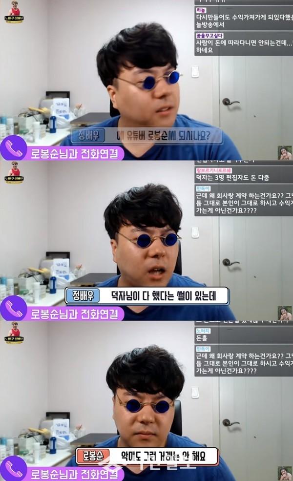 정배우는 20일 자신의 유튜브 채널 '정배우JungTube'를 통해 ACCA 에이전시 대표 BJ 턱형과 소속 BJ들간의 부당 계약 의혹과 관련해 BJ 로봉순과의 전화연결을 시도해 다양한 이야기를 나눴다.