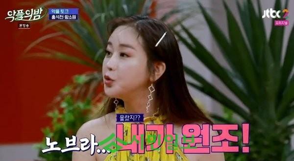 이날 함소원은 "노브라는 내가 원조다"고 운을 뗐다. 그는 "지난 2009년에 첫 드라마를 찍었다. 그때 노브라를 했는데 엄청 혼났다"면서 "시청자들이 보일 정도로 노브라는 아니었다. 촬영하면서 선배님이 아시고 '너 이러면 안된다'해서 멈췄다"고 당시를 떠올렸다.