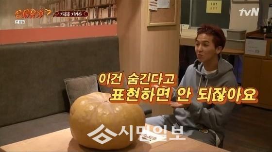 대왕호박을 받은 송민호는 황당해 했다. "이걸 숨긴다고 표현할 수 있냐"면서 "의자로 써야한다"고 말했다. 그러면서 화분을 치우고 호박을 올려놨다. 호박을 찾은 멤버들은 "이렇게 큰 거를 여기에 놓으니 안 걸리겠느냐"고 폭소했다.