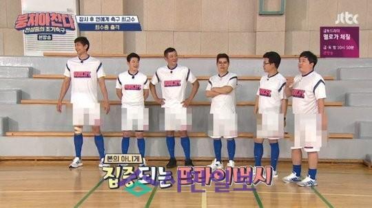 이어 골키퍼 유니폼이 공개됐다. 노란색 유니폼에 정형돈은 “단무지냐 뭐냐”고 따졌다. 선수들은 유니폼 재질에 속옷이 다 비칠 것을 염려했다. 안정환은 “우린 약간 섹시하다”고 너스레를 떨었다.