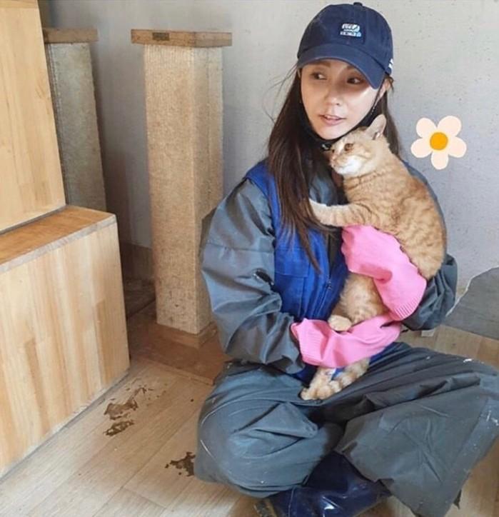 공개된 사진 속 안혜경은 고무장갑을 끼고 고양이와 함께 카메라를 쳐다보고 있는 모습이다.