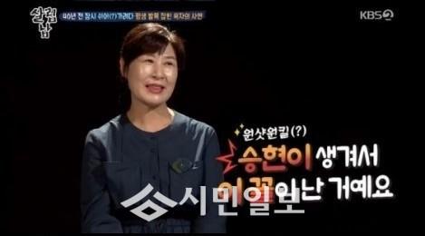 김승현의 어머니는 40년 전 기억을 떠올리며 "원래 그 날 (김승현의 아버지와) 헤어지려고 했었어요. 받았던 선물들도 다 들고 나갔는데 대구로 데려가더라고요. 근데 그 친구들이 놀이공원에 데려가서 놀이기구를 너무 태우는 거예요. 그래서 너무 어지러워서 좀 쉬자고 했는데 어쩌다 보니 여인숙이더라고요. 그때 승현이가 생겨서 헤어지지도 못하고"라며 한숨을 내뱉어 폭소를 자아냈다.