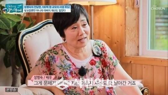이에 성병숙은 “그건 은행 빚이다. 회사 거다. 내가 가진 건 다 없어졌다. 내가 (전남편) 보증선 게 있었다. 그게 내 거다. 5천만 원인 줄 알고 서명을 했는데 4장이었다”며 자신이 갚은 빚은 자신이 보증 선 2억 원이라고 말했다.