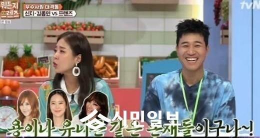 최근 방송된 tvN '뭐든지 프렌즈‘에선 신지와 김종민이 출연했다. 이날 MC 붐은 신지에게 소문에 대한 질문을 던져 이목을 사로잡았다.