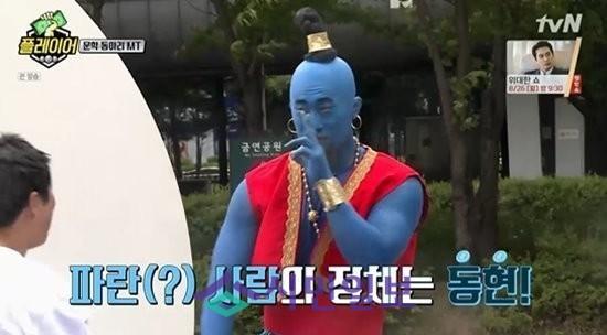 이 때 멀리서부터 존재감을 드러낸 사람이 있었고, 이는 바로 김동현이었다. 김동현은 온몸에 파란색으로 칠을 하고는 영화 '알라딘' 속 지니로 완벽하게 변신했다.