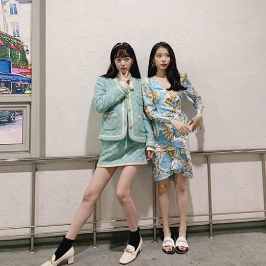 공개된 사진에는 설리와 아이유가 촬영장에서 포즈를 취하는 모습이 담겼다. 특히, 우아한 공주풍 원피스를 입은 두 사람의 인형 미모가 시선을 사로잡는다.
