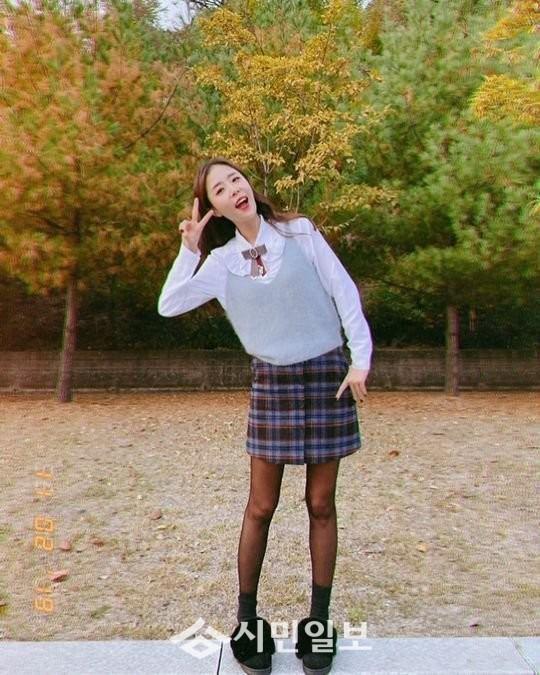 사진 속에는 짧은 체크무늬 스커트를 입은 신지의 모습이 담겼다.