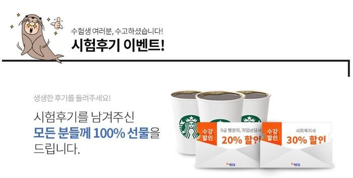 에듀윌에 따르면 18회 사회복지사 1급 시험을 치른 수험생이라면 선물을 받을 수 있다. 오는 28일까지 시험 관련 후기를 남기면 수강할인권을 100% 제공하는 것.