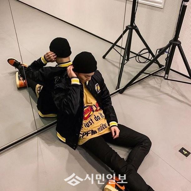 사진 속 수호는 'Just do it'이라고 적힌 노란 티셔츠에 검은 자켓과 바지를 입고 안무실 거울에 기대앉아있다. 수호는 검은 비니를 쓴 머리를 만지며 티셔츠를 내려다보고 있는 모습으로 감탄을 자아냈다.