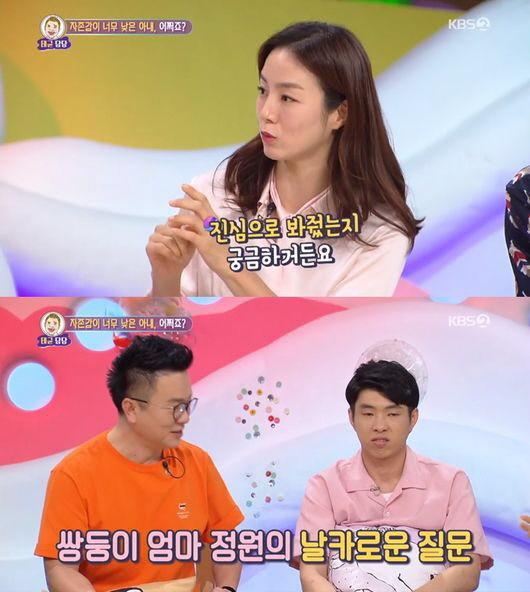 문정원은 "아내의 눈을 바라보고 예쁘다고 얘기해본 적이 있냐"며 "아내가 물어보기 전에 먼저 예쁘다고 얘기해준 적 있냐"고 물었다. 이에 남편은 "아내가 먼저 물어볼 때만 얘기해줬다"고 말했다.