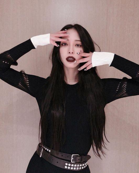 한예슬은 검붉은빛 섀도로 음영을 더했고, 핏빛 립스틱으로 입술을 가득 채웠다. 뿐만 아니라 왼쪽 눈꼬리 아래에는 거미를 그렸다.