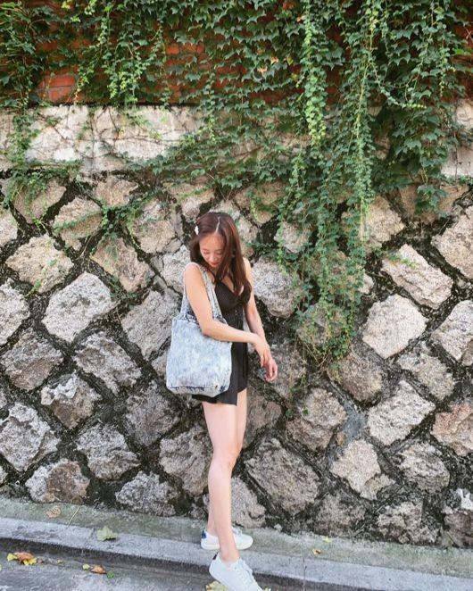 사진 속 니콜은 돌담길 앞에 서서 활짝 웃고 있다. 니콜은 검은색 나시 원피스를 입고 흰 운동화를 신었다.