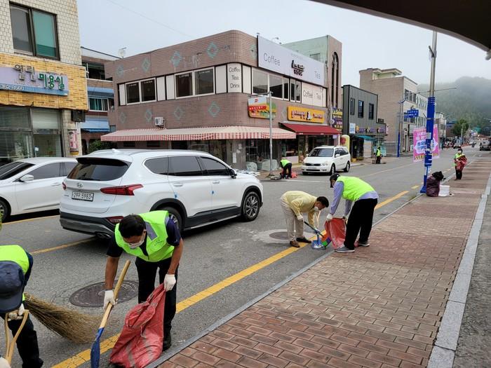 가을을 맞이해 전남 곡성군 옥과면이 최근 이장단과 함께 시가지 청소를 실시했다. 이날 시가지 청소는 코로나19 방역수칙을 철저히 준수하며 인원이 집중되지 않도록 4인 1조로 역할을 분담해 작업이 진행됐다. 사진은 참여자들이 청소를 하고 있는 모습.(사진제공=곡성군청)
