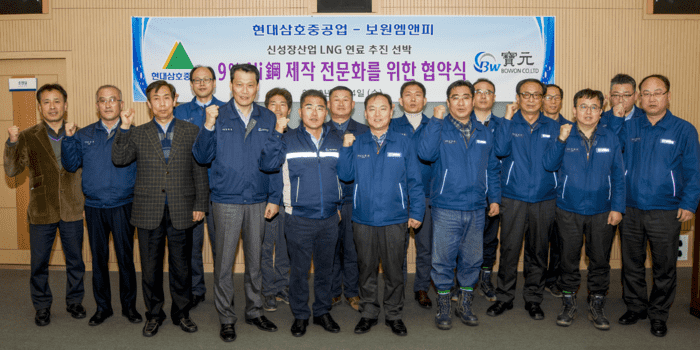 현대삼호중공업은 지난 4일 회사 홍보관에서 영암 대불산단에 입주해 있는 협력회사인 보원엠앤피(주)와 ‘신성장산업 LNG추진선 연료탱크 제작 전문화를 위한 협약식’을 개최했다.