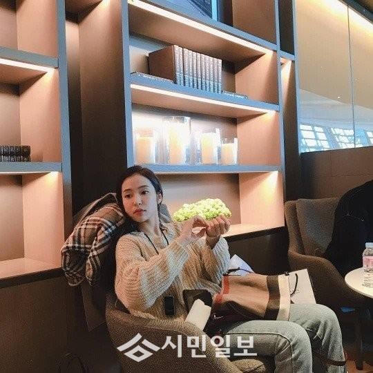 공개된 사진 속 홍자는 비행기 지연으로 인해 라운지에서 쉬는 모습이다. 그는 니트와 청바지를 입어 편안한 차림으로 손톱을 매만지고 있다.