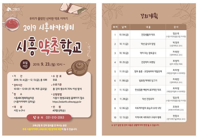 시흥약초학교는 시민들이 일상생활에서 도움이 될 수 있는 약초에 대한 이론교육과 약초를 활용한 음식, 발효청, 차 등을 배울 수 있는 실습교육으로 커리큘럼이 구성돼 있다.
