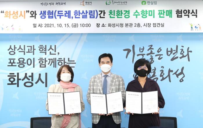 [화성=김정수 기자] 경기 화성시는 지난 15일 시청 접견실에서 두레생협연합회, 한살림사업연합회와 친환경인증 수향미 판매 및 친환경 농산물 판로개척을 위한 업무협약을 체결했다고 밝혔다.