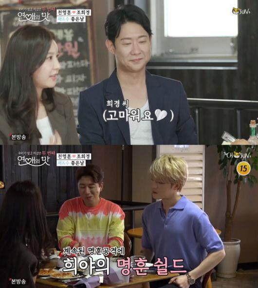 29일 방송된 TV조선 '연애의 맛2'에서는 천명훈 조희경의 데이트가 담겼다. 이날 조희경은 천명훈과 식당에 들어섰다. 식당에는 '연애의 맛2' 패널인 장수원과 김재중이 앉아 있었다.