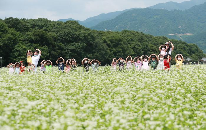 [함양=이영수 기자]경남 함양군 천년의 숲 상림공원 경관단지에 메밀꽃이 만개해 나들이 나온 연꽃어린이집 원생들이 메밀꽃 사잇길을 걸으며 즐거운 시간을 보내고 있다.
