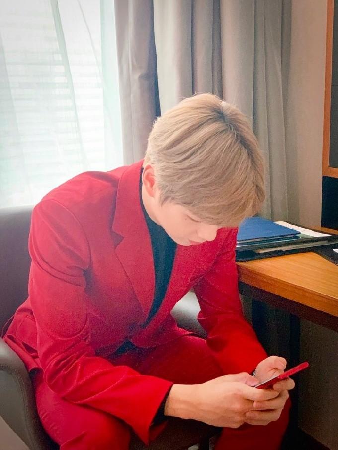 공개된 사진에서 강다니엘은 붉은 슈트를 입고 핸드폰을 만지고 있는 모습이 담겨져 있다. 특히, 휴대폰에 집중하며 고개를 숙인 모습에도 드러나는 훈훈함이 시선을 사로잡는다.