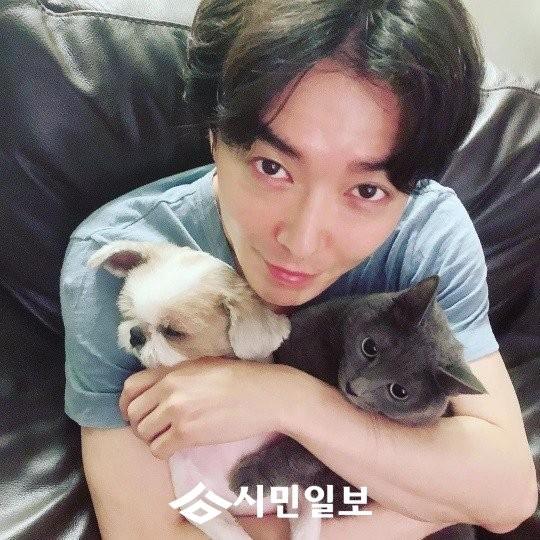 공개된 사진 속 김재욱은 귀여운 강아지와 고양이를 안고 카메라를 올려다보고 있다.