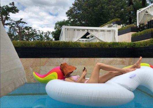 공개된 사진 속에는 수영장에서 분홍색 비키니를 입은 옥주현이 튜브 위에서 휴식을 취하고 있는 모습이 담겨 있다. 옥주현의 완벽한 각선미와 몸매가 시선을 사로잡는다.