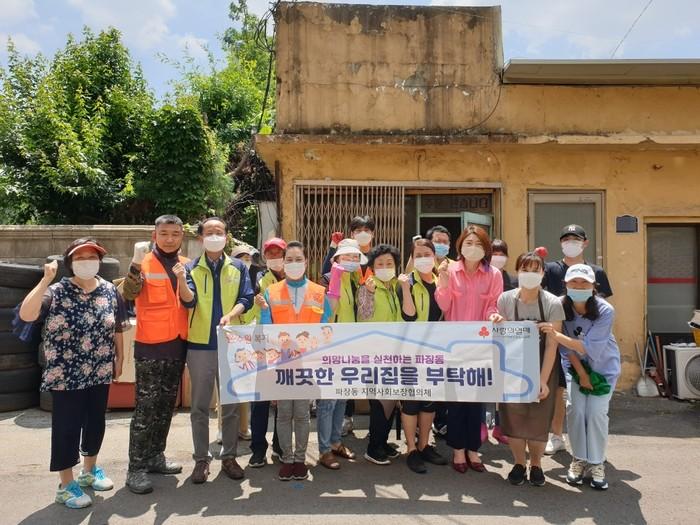 경기 수원시 장안구 파장동은 지난 11일 지역사회보장협의체와 수원시자원봉사센터 봉사자들과 함께 ‘깨끗한 우리집을 부탁해’ 4차사업의 일환으로 지역내 홀몸노인 2가구를 방문해 주거환경을 개선했다. 이날 봉사자들은 집안에 있는 2톤가량의 쓰레기를 수거했다. 사진은 봉사자들이 기념촬영을 하는 모습.(사진제공=장안구청)