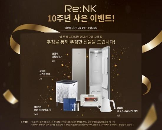 고기능성 프리미엄 코스메틱 브랜드 리엔케이(Re:NK)는 브랜드 론칭 10주년을 기념하여 9월 한 달 동안 ‘셀 투 셀 에센스 시그니처 에디션’을 구매한 모든 고객 중 Club Re:NK 가입 고객을 대상으로 추첨을 통해 다양한 사은품을 증정한다고 밝혔다.