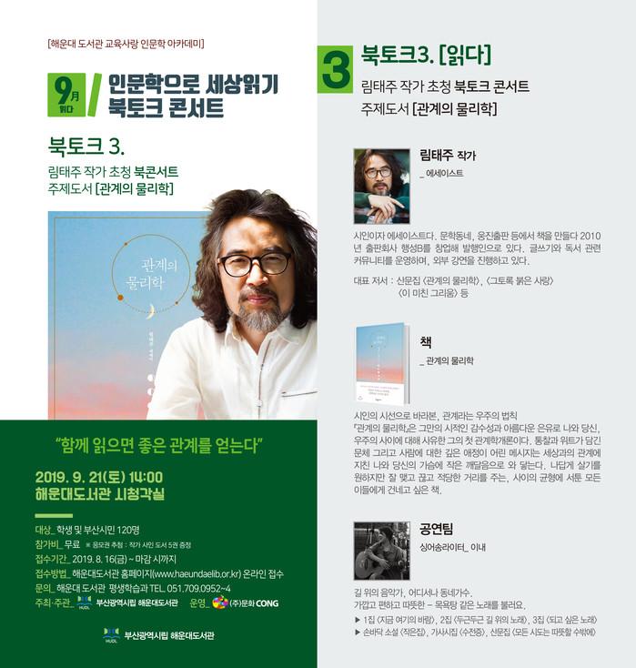 부산 시립 해운대도서관(관장 김영진)은 9월 21일 해운대도서관 시청각실에서 청소년과 지역주민 등 120명을 대상으로 ‘인문학으로 세상읽기 북 토크 콘서트’의 세 번째 시간을 갖는다.