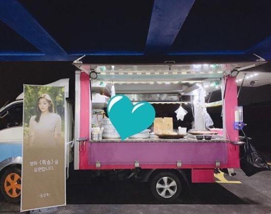공개된 사진 속에는 배우 송강호가 후배 박소담에게 보낸 간식차의 모습이 담겨 있다. 송강호는 현재 영화 '특송'을 촬영 중인 박소담을 위해 늦은 시간 허기를 달랠 수 있는 음식들을 선물했고, "영화 '특송'을 응원합니다"라는 멘트도 더했다.