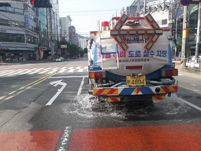 | ▲김해시는 폭염대책의 하나로 인구밀집지역인 북부, 내외, 장유지역 대로변 을 중심으로 살수차를 운행하고 있다. |