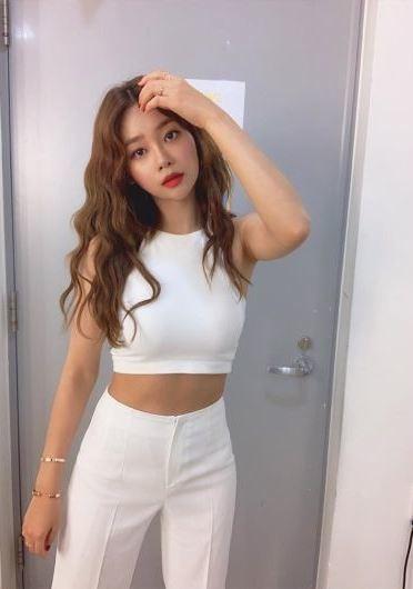 사진 속 유나는 흰색 크롭 민소매에 흰색 슬랙스를 입고 머리카락을 넘기려는 듯, 손을 들고 있다.