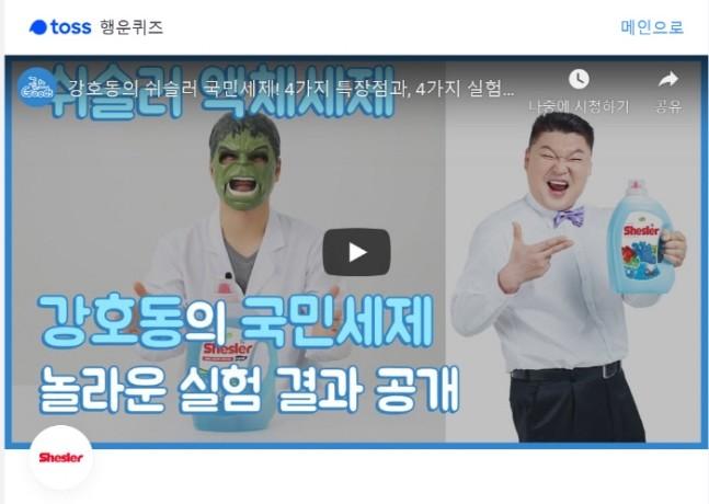 토스 행운퀴즈 출제자 측은 “포털사이트에 ‘강호동 쉬슬러 액체세제’를 검색 후 ‘지마켓브랜드관‘을 참고하세요”라며 힌트를 제시했다.