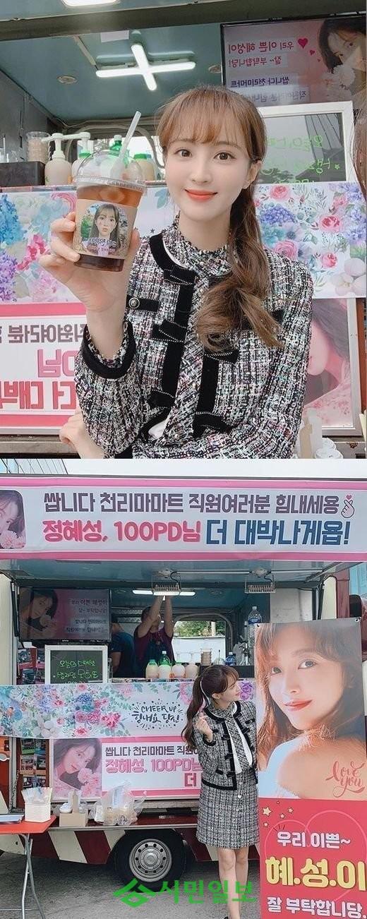 사진 속 정혜성은 커피차 앞에서 포즈를 취한 모습이다. 이 커피차는 정혜성의 절친 조보아가 보낸 것으로 그는 ‘우리 예쁜 혜성이 잘 부탁한다’라는 당부도 전했다.