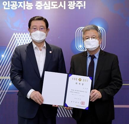| ▲ 이용섭 광주광역시장(좌측)이 5일 오전 시청 접견실에서 김인재 광주시립합창단 지휘자에게 위촉장을 전달한 후 기념촬영을 하고 있다./광주광역시 제공 |