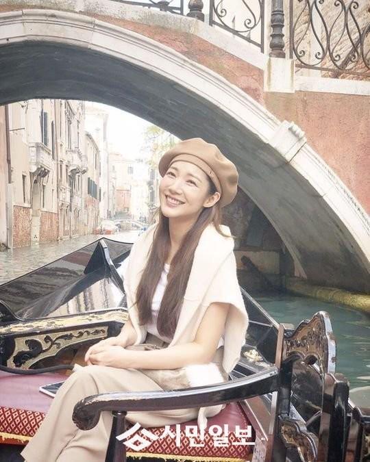공개된 사진 속 박민영은 베레모를 쓰고 미소 짓고 있다.