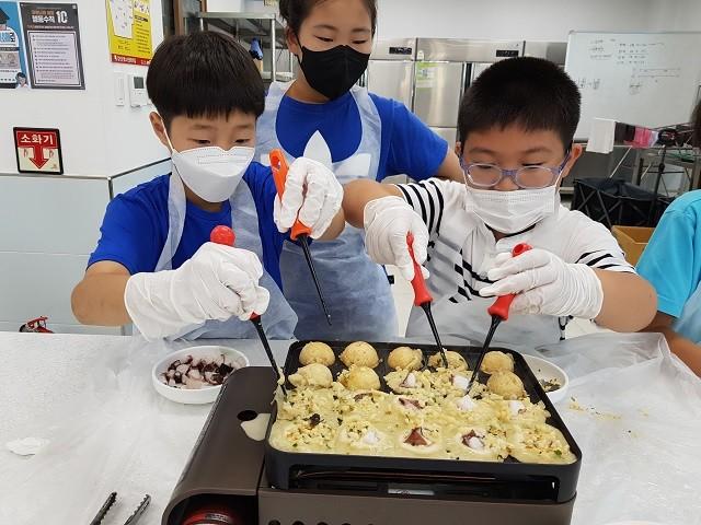 | ▲ 강진군 관내 청소년들이 강진청소년수련시설이 여름방학 기간(7월27일~30일) 동안 실시하고 있는 ‘다문화 음식문화 체험’ 에 참여해 타코야키 일본 음식을 직접 만들어 보고 있다. / 사진=강진군 제공 |