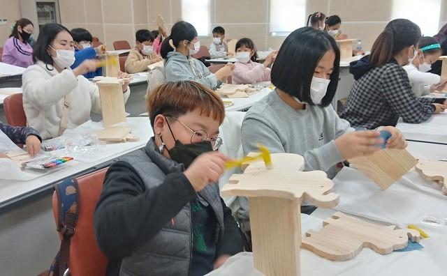 | ▲ 강진군 다산박물관이 운영 중인 체험프로그램 교실에서 책꽃이 만들기에 열중하고 있는 학생들 / 강진군 제공 |